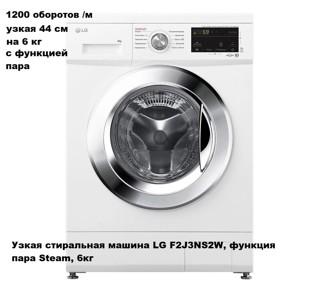 Стиральная машина LG F2J3NS2W узкая, 6 кг, с функцией пара, инверторным мотором с прямым приводом и 10 автоматическими программами, белая
