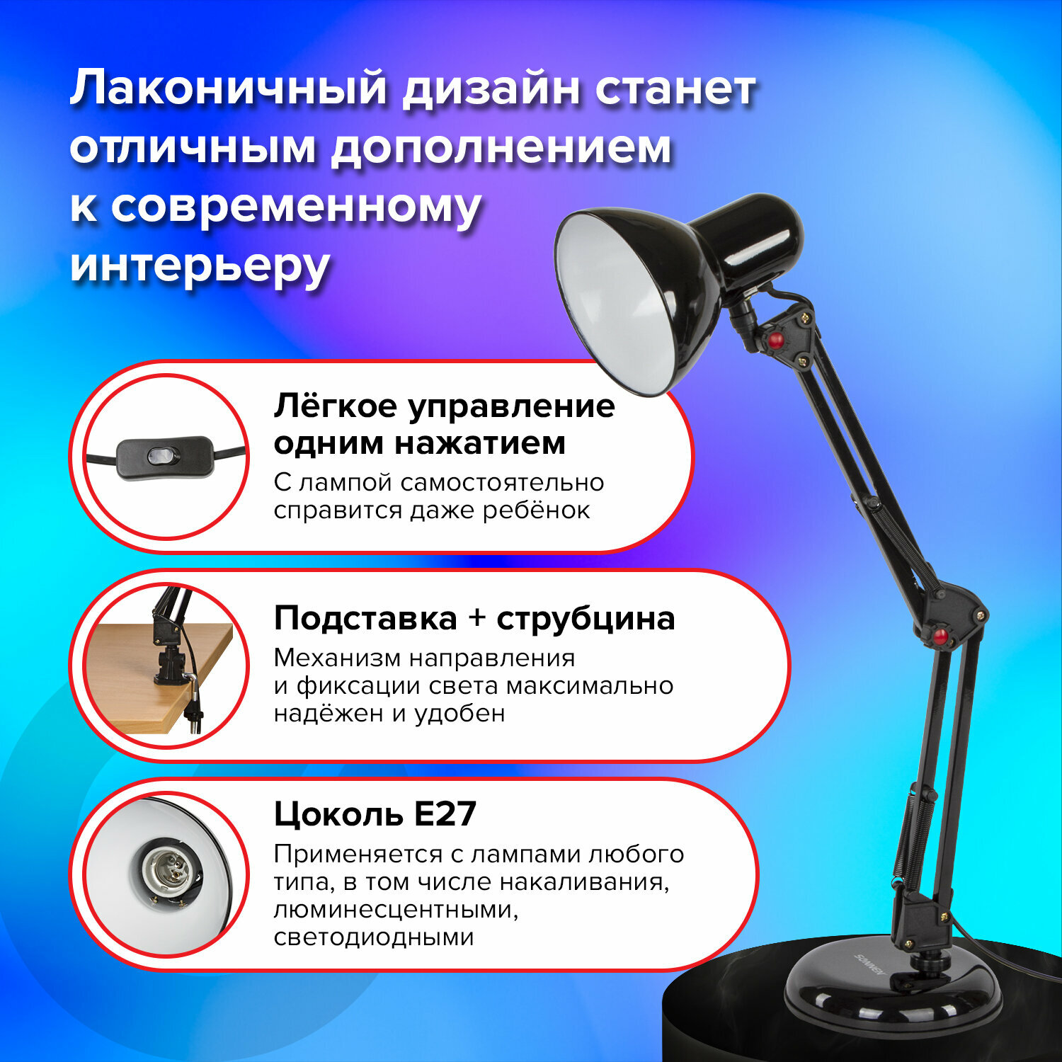 СохранитьНастольная лампа Sonnen TL-007, на подставке + струбцина, 40 Вт, Е27, черный, высота 60 см, 235540 интересное: