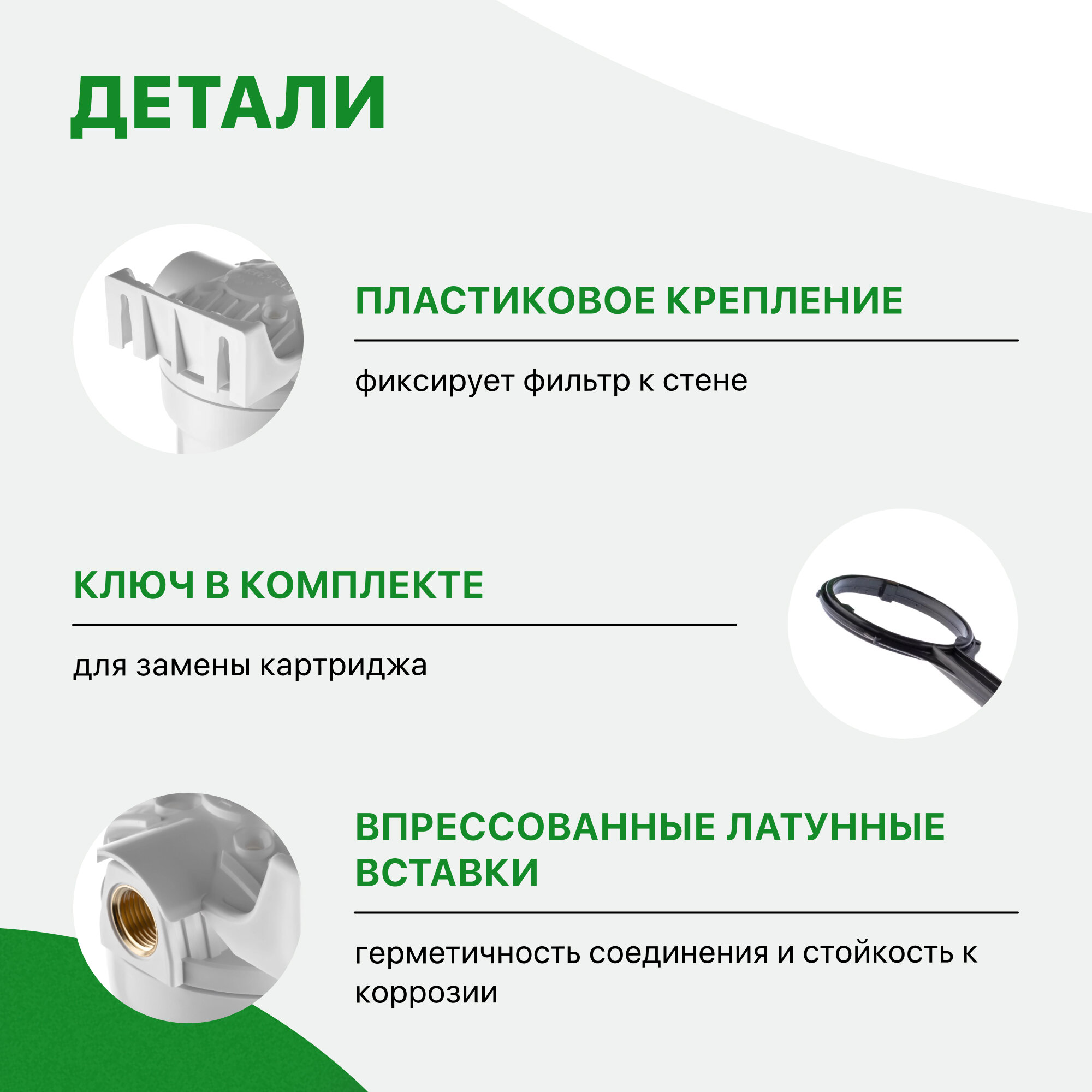 | Дополнительная информация | макс. температура воды на входе: 40 °C; макс. давление на входе: 7 атм; применяется совместно с картриджем 10 SL; присоединительный размер: 1/2"; в комплекте ключ для замены картриджей |