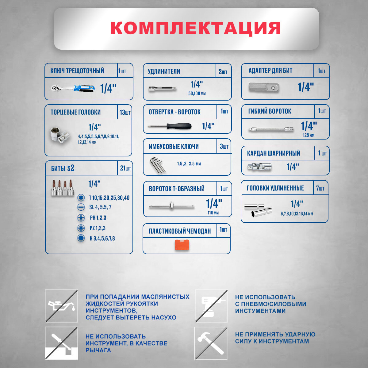 | Головки торцевые подробно | 1/4": 4, 4.5, 5, 5.5, 6, 7, 8, 9, 10, 11, 12, 13, 14 мм; удлинённые 1/4": 6, 7, 8, 10, 12, 13, 14 мм; с наконечниками 1/4": T10, T15, T20, T25, T30, T40, H3, H4, H5, H6, H7, H8, S4, S5.5, S7, PH1, PH2, PH3, PZ1, PZ2, PZ3 |