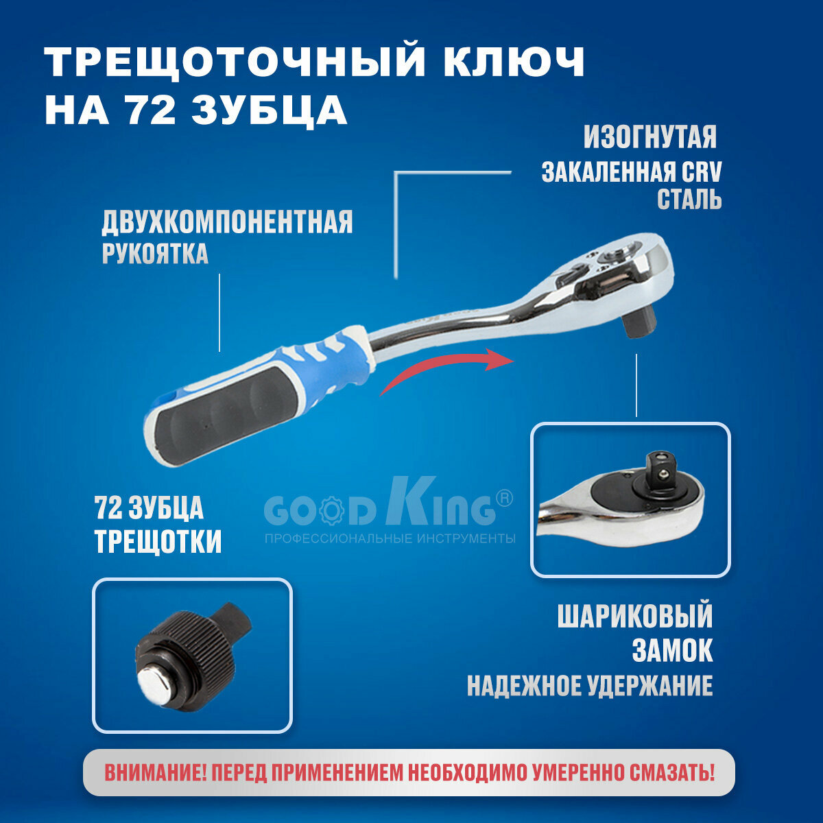 | Плюсы: | Компактный, 72 зуба, длинные головки, хромированое покрытие, изогнутая ручка трещетки. |