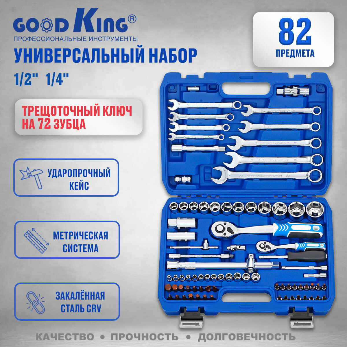 Набор инструментов 82 предмета 1/4" 1/2" трещотка 72 зуба GOODKING B-10082 торцевые головки, биты, комбинированный ключ, трещеточный ключ
