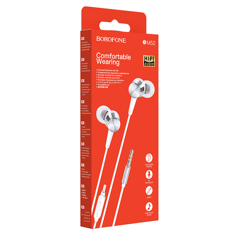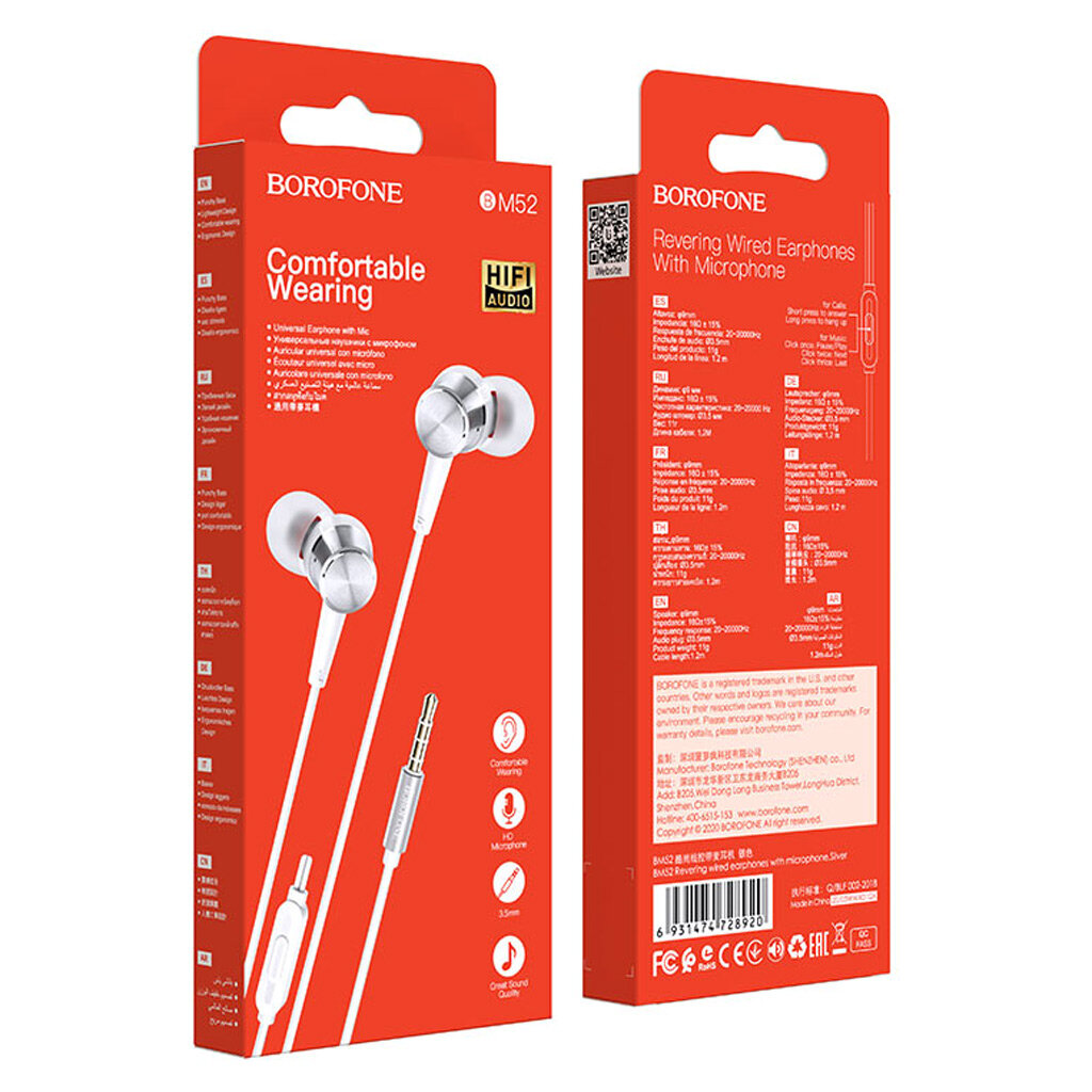 Наушники внутриканальные Borofone BM52, Revering wired, микрофон, кнопка ответа, регулятор громкости, цвет серебряный