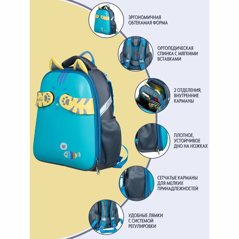 Рюкзак школьный Комус Котик с рыбкой, портфель анатомический для мальчика и девочки, 2 отделения, 4 кармана