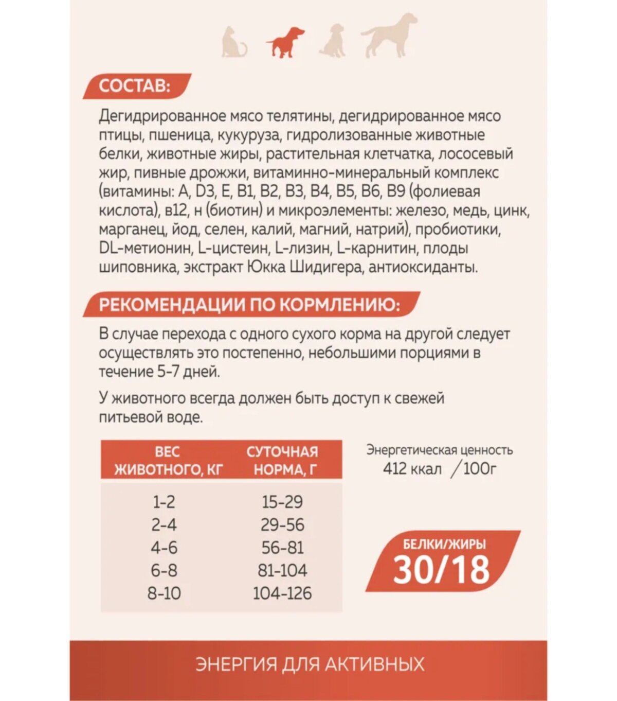 | Состав | дегидрированное мясо телятины, дегидрированное мясо птицы, пшеница, кукуруза, гидролизованные животные белки животные жиры, растительная клетчатка, лососевый жир, пивные дрожжи, витаминно-минеральный комплекс (витамины: А, D3, Е, В1, В2, В3, В4, В5, В6, В9 (фолиевая кислота), В12, Н (биотин) и микроэлементы: железо, медь, цинк, марганец, йод, селен, калий, магний, натрий), пробиотики, DL-метионин, L-цистеин, L-лизин, L-карнитин, плоды шиповника, экстракт Юкка Шидигера, антиоксиданты |