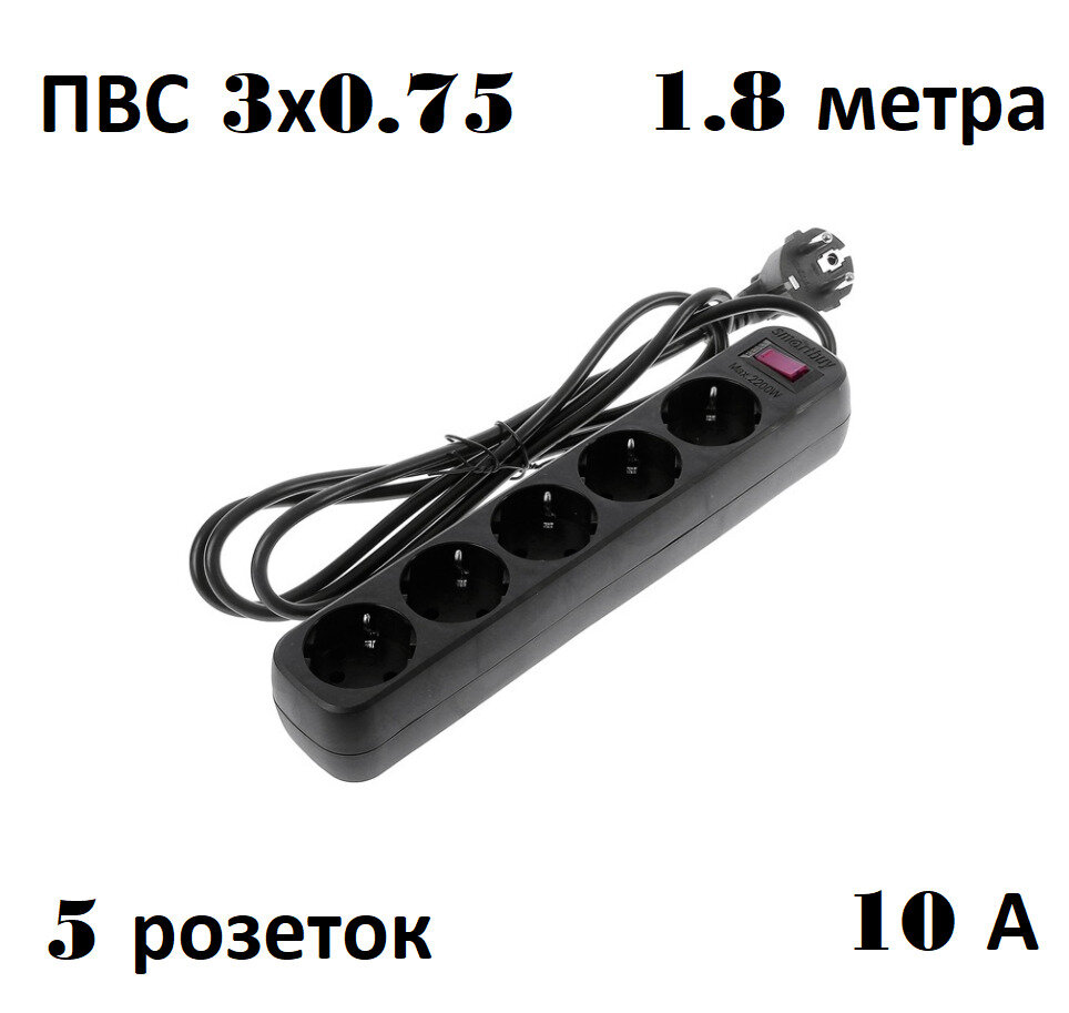 Сетевой фильтр Smartbuy ПВС 3х0.75 5 роз. 1,8м 10A черный, земля, выкл. (SBSP-18-K)