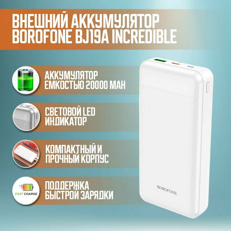 Мобильный аккумулятор BOROFONE BJ19A Incredible 20000mAh, пластик, QC3.0, 1 USB выход, микро USB, PD20W, индикатор, 3.0A, белый (6974443381610)