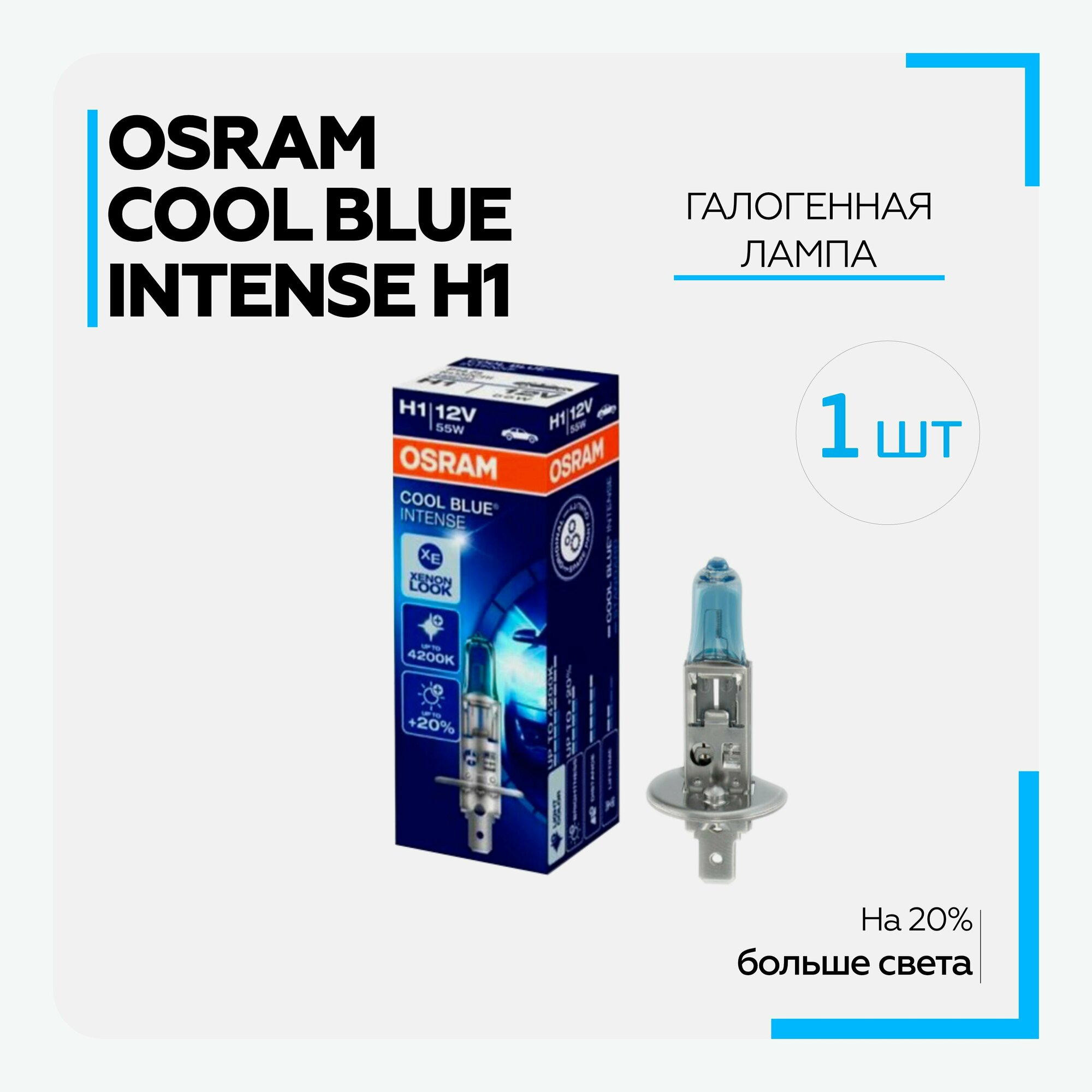 Лампа автомобильная галогенная Osram COOL BLUE INTENSE (+20% света), 64150CBI-01B, H1, 12V, 55W, P14.5s, 4200K, 1550lm (блистер) (1 шт.)