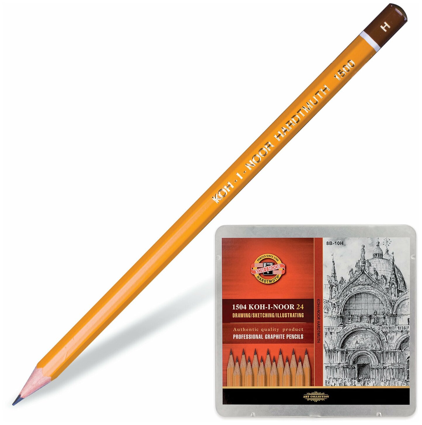 Карандаши чернографитные KOH-I-NOOR 1500, набор 24 шт., 8В-10H, без резинки, металлическая коробка, 1504024001PL Комплект - 1 шт .