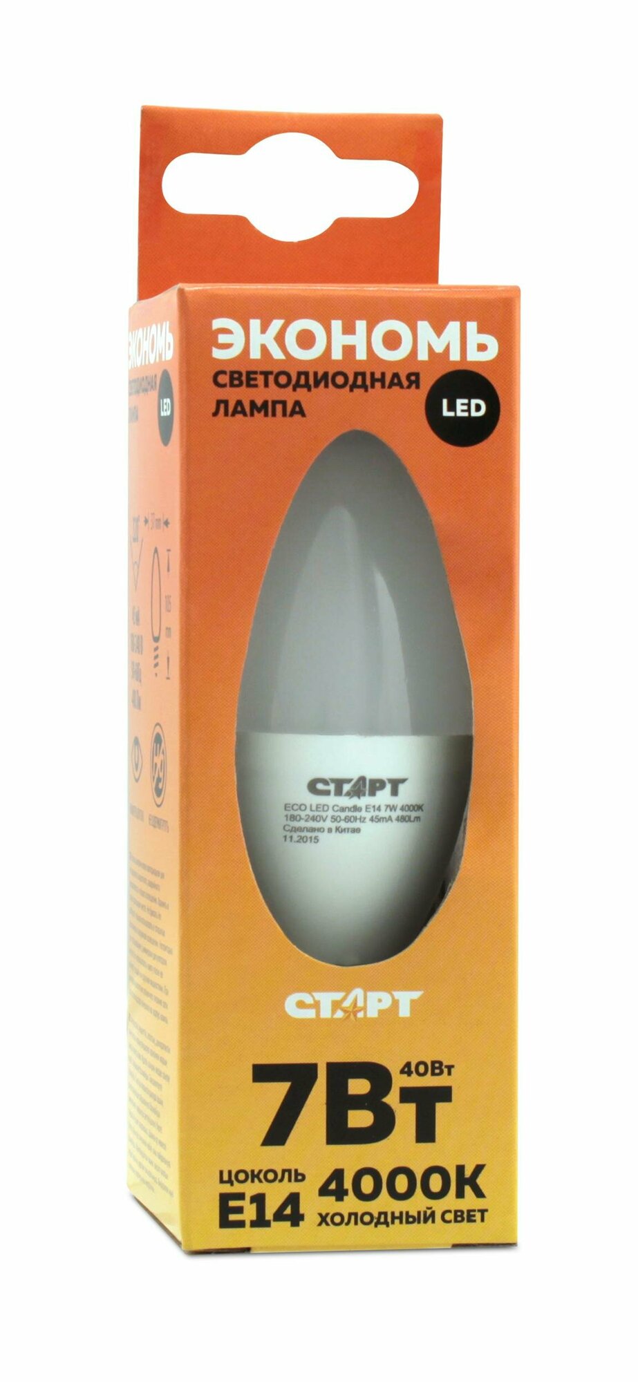 Лампа светодиодная Старт LED, серия ЭКО 7W40, тип С свеча, E14, 4000К, холодный свет, 15000 ч