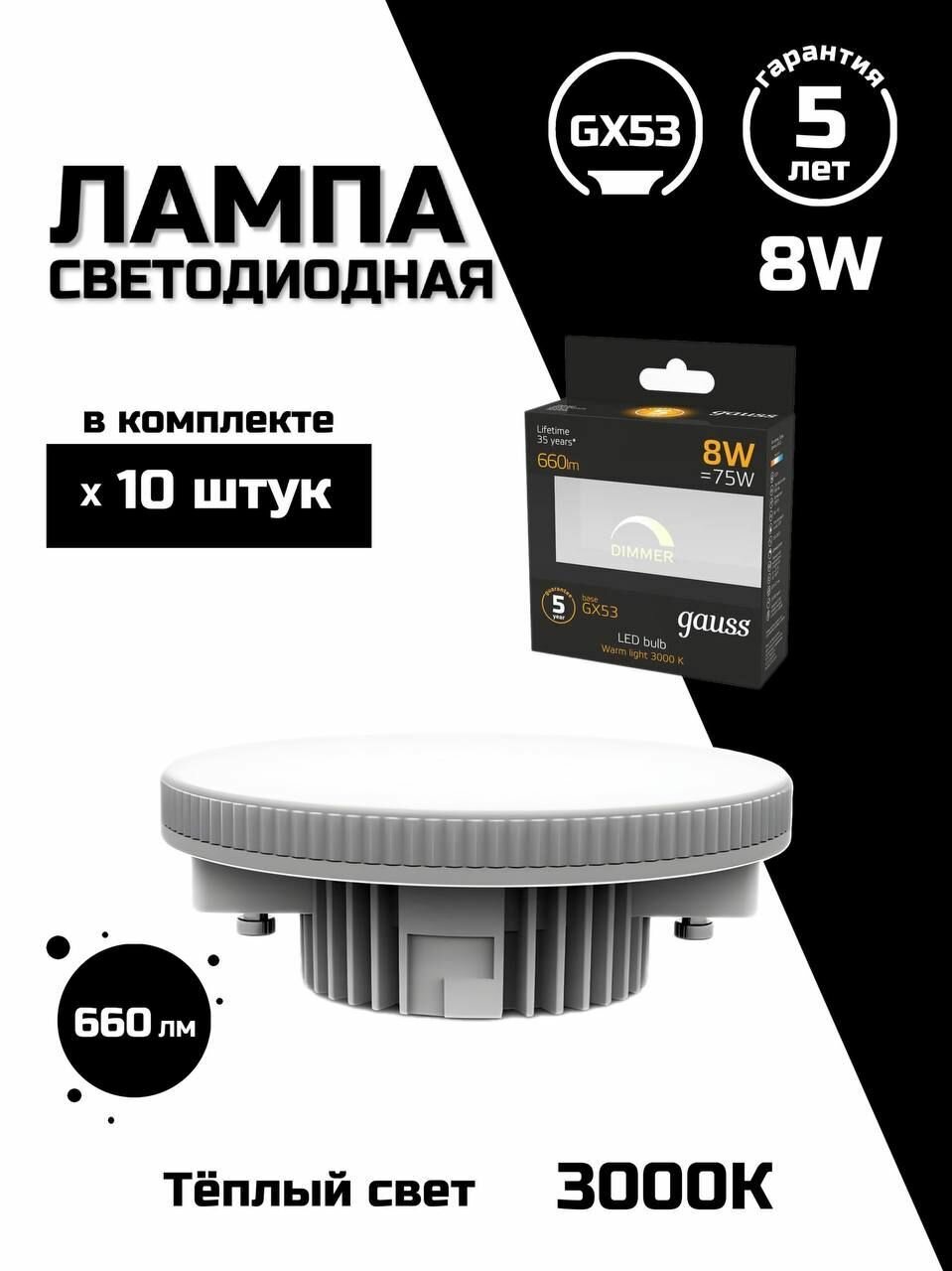 Лампа Gauss GX53 8W 660lm 3000K диммируемая LED 1/10/100