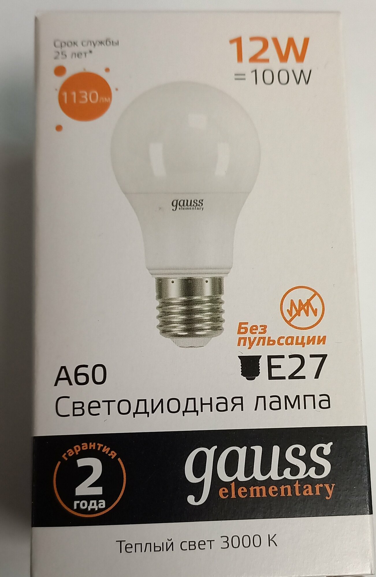 Лампа светодиодная Gauss 12 вт, цоколь е27, груша, теплый белый, 25000 ч, a60-12w-3000-e27