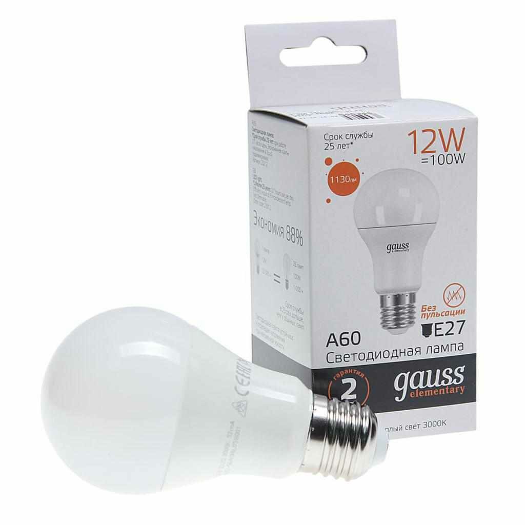 Лампа светодиодная gauss Elementary 23212, E27, A60, 12 Вт, 3000 К