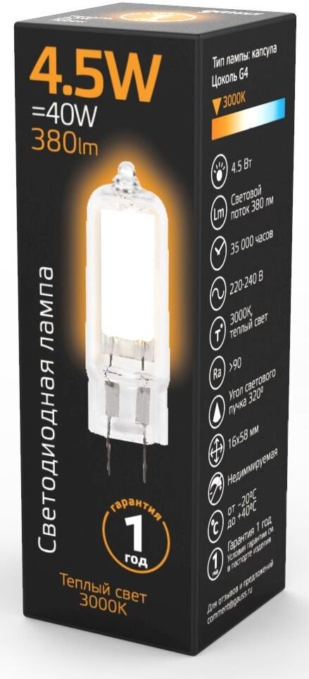 Лампа светодиодная gauss 107807104, G4, 4.5 Вт, 3000 К