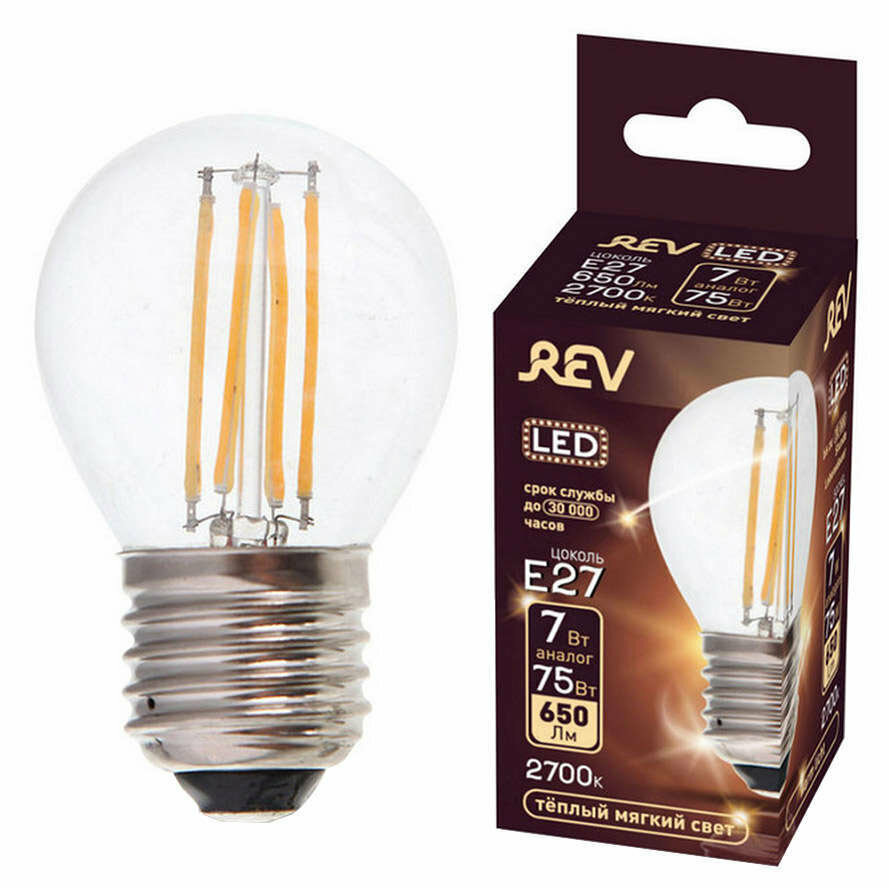 Лампочка REV 32443 FILAMENT Шарик G45 7 Вт, E27, прозрачный