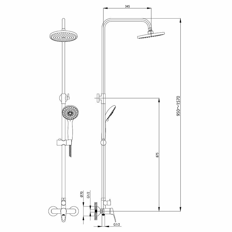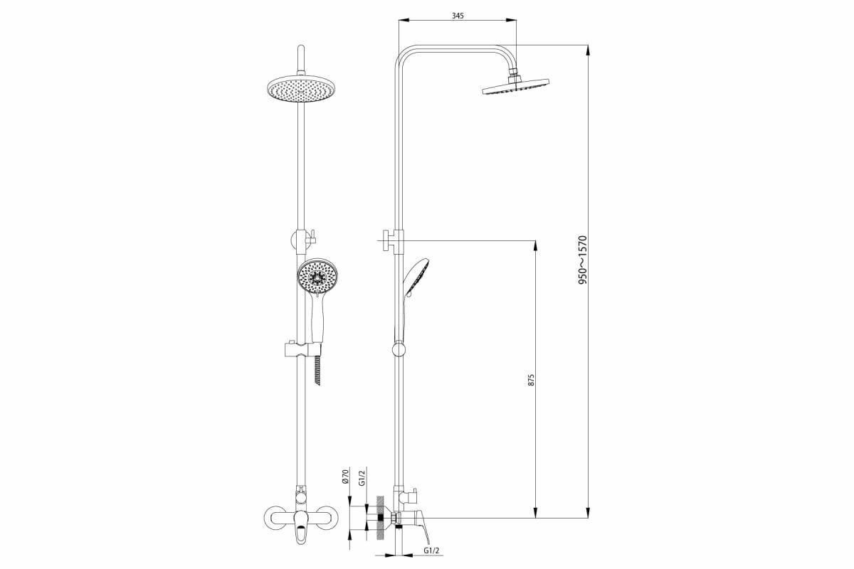| Дополнительная информация | максимальная высота стойки для душа: 1585 мм; диаметр верхнего душа: 200 мм; крепление для ручной лейки регулируется по высоте |
