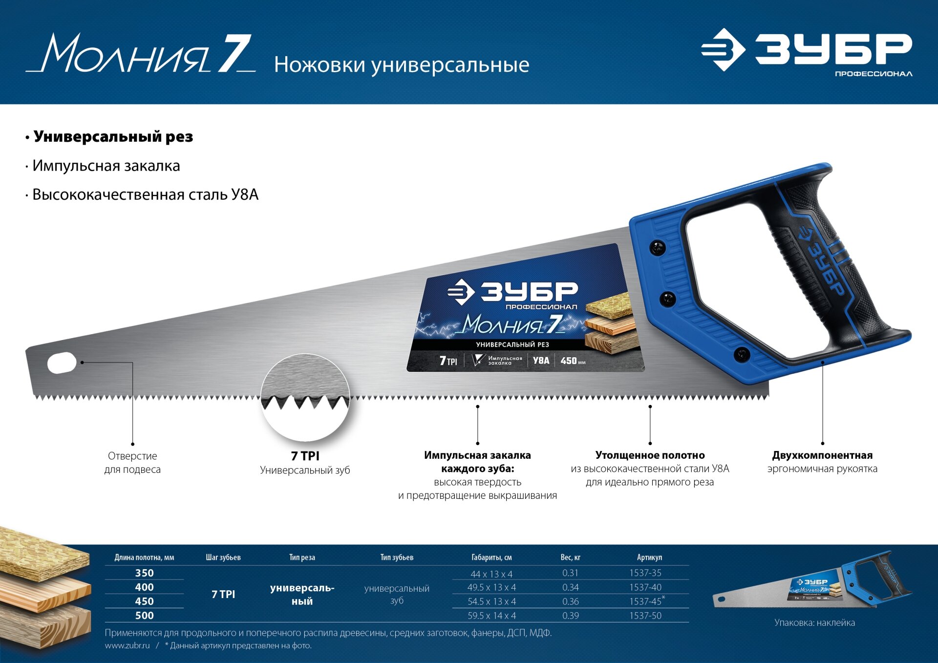 ЗУБР Молния-7, 500 мм, 7TPI, универсальная ножовка, Профессионал (1537-50)