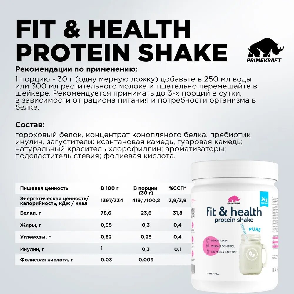 Купить Растительный протеин Fit & Health Protein Shake PRIMEBAR Чистый, 500 г