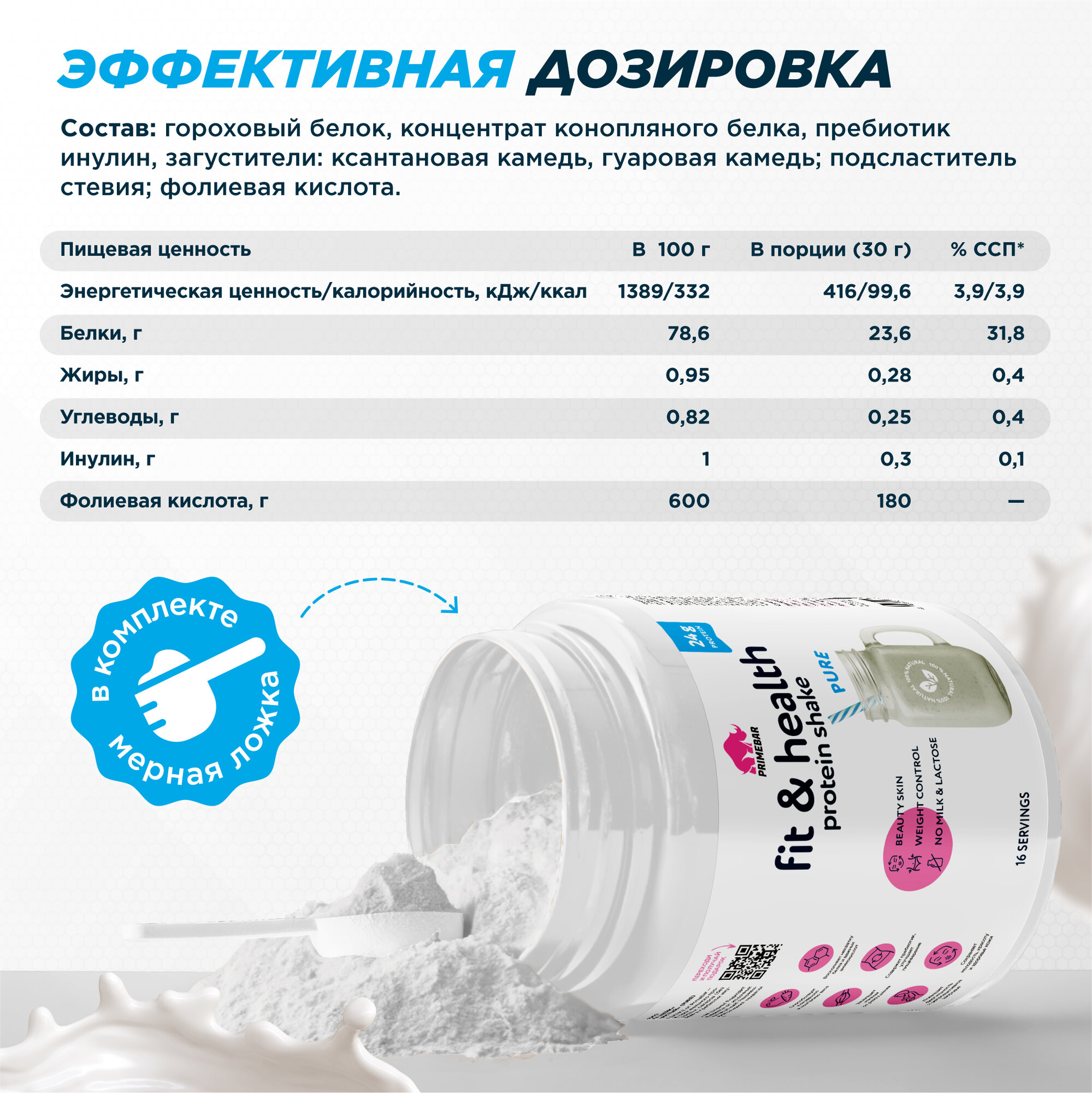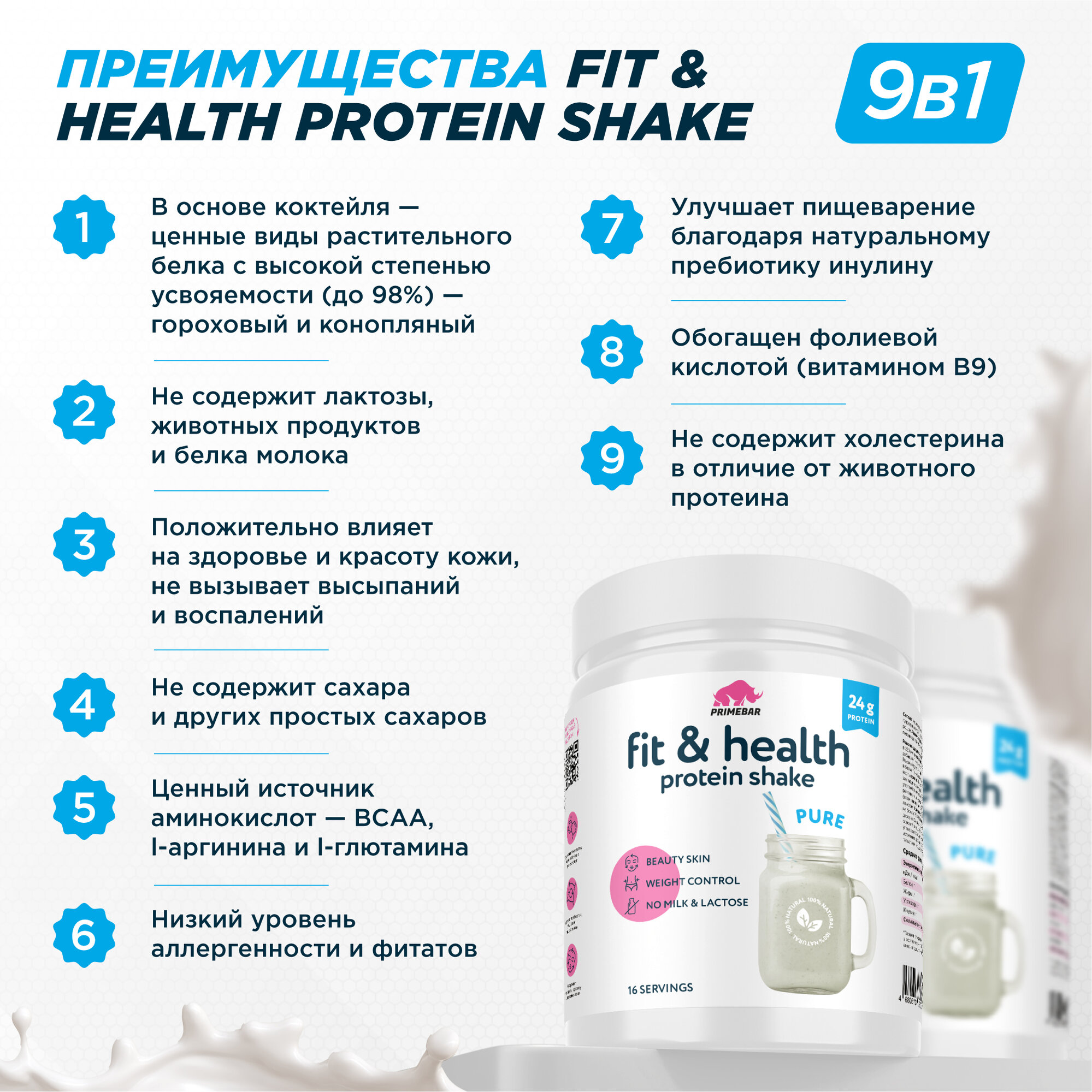 Растительный протеин Fit & Health Protein Shake PRIMEBAR с нейтральным вкусом (pure), 500 г / Без лактозы / Гороховый белок