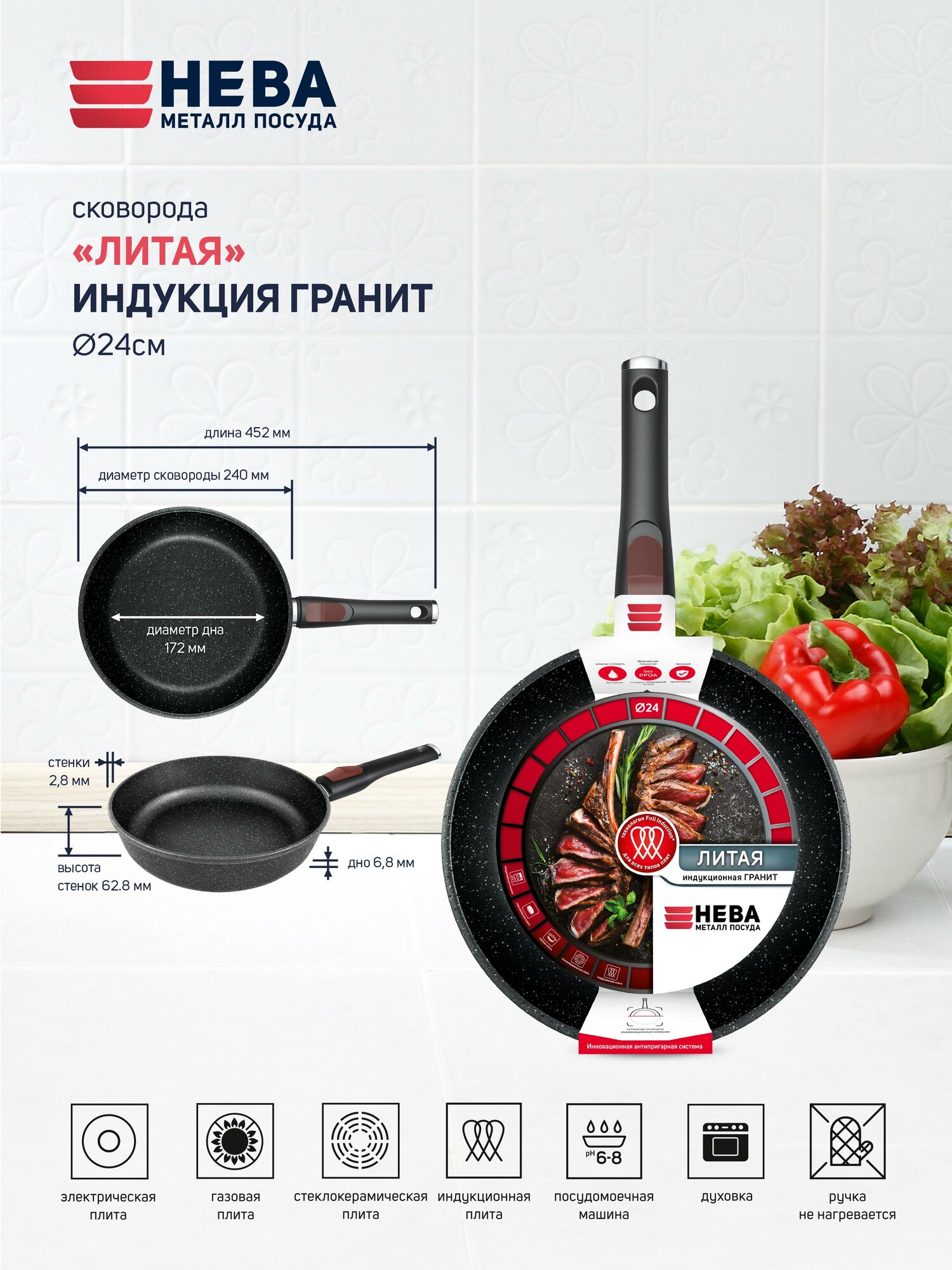 Сковорода 24 литая Индукция Гранит с/р L18024i Нева металл посуда