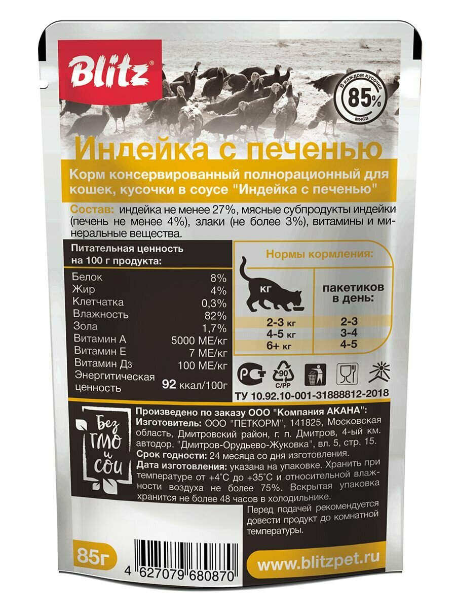 Консервы BLITZ для кошек Индейка с Печенью в соусе пауч 85г (24 шт. в упаковке)
