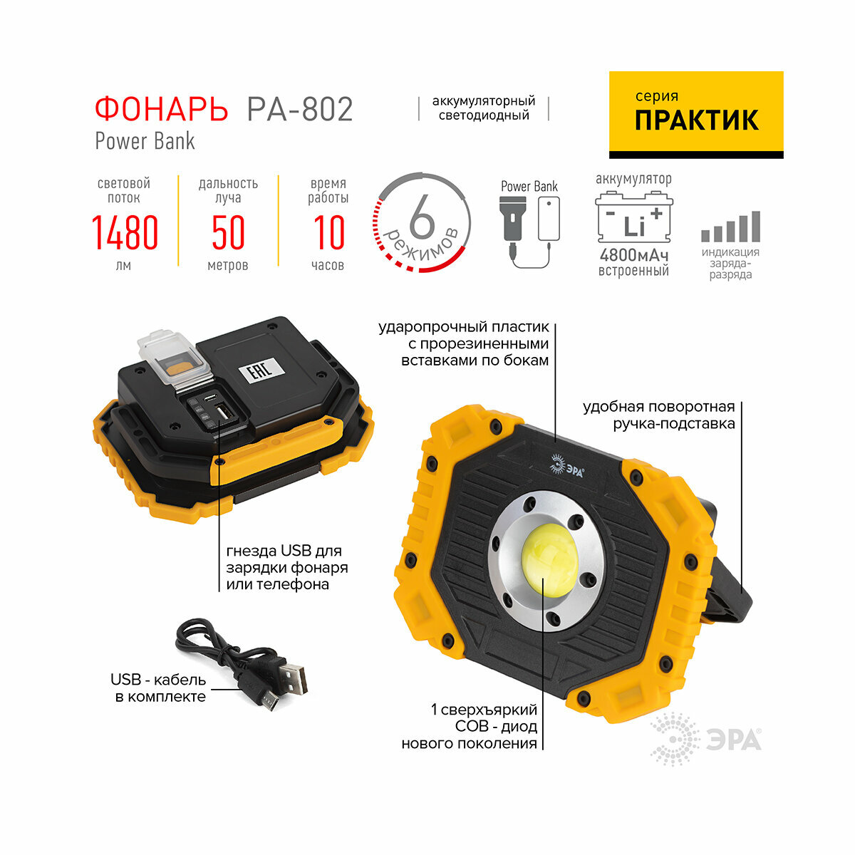 Светодиодный фонарь ЭРА Рабочие Практик PA-802 прожектор аккумулятор 15Вт, Cob, 6 режимов, Б0054038 .
