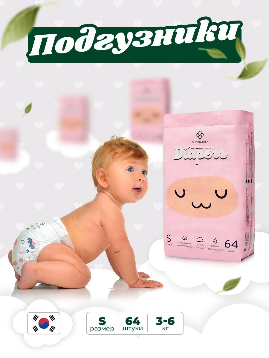Купить SUPERGREEN Подгузники для детей размер S (3-6 кг) Premium Baby Diapers, 64 шт