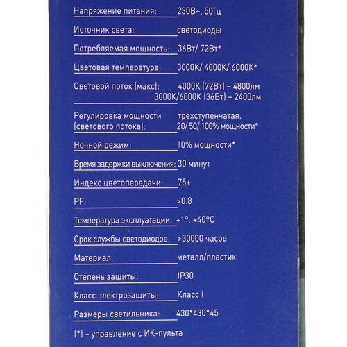 | Дополнительная информация | светильник имеет 6 режимов работы: 3 режима меняют световую температуру (теплый, нейтральный, холодный), другие 3 режима меняют яркость освещения: 20, 50 и 100%; включение, отключение и управление режимами осуществляется с помощью инфракрасного пульта, который входит в комплект |