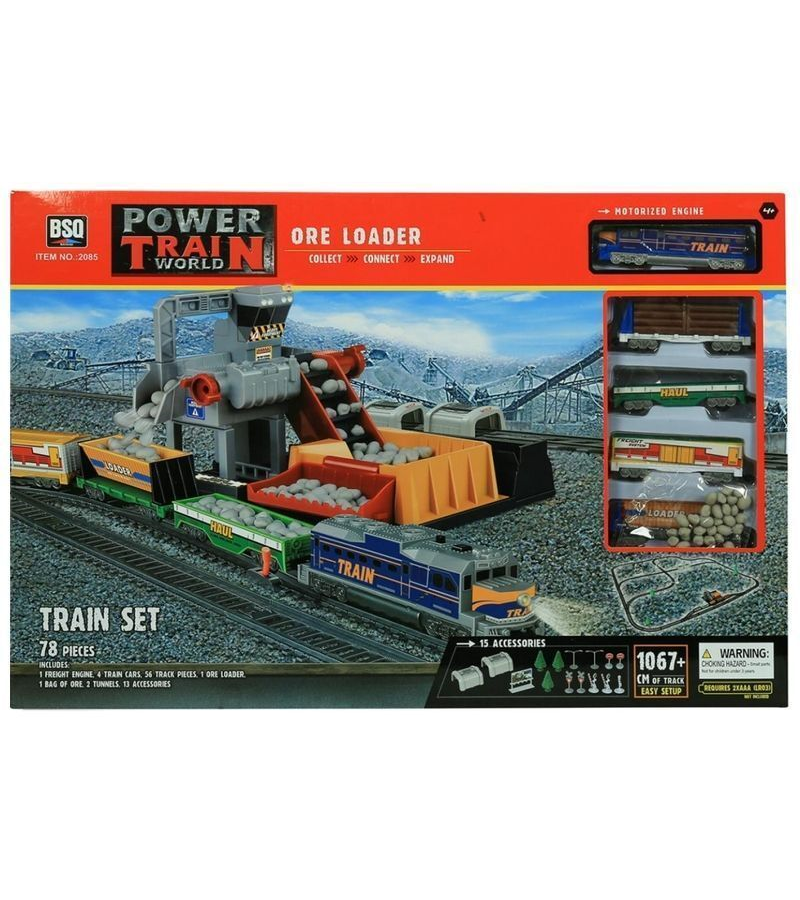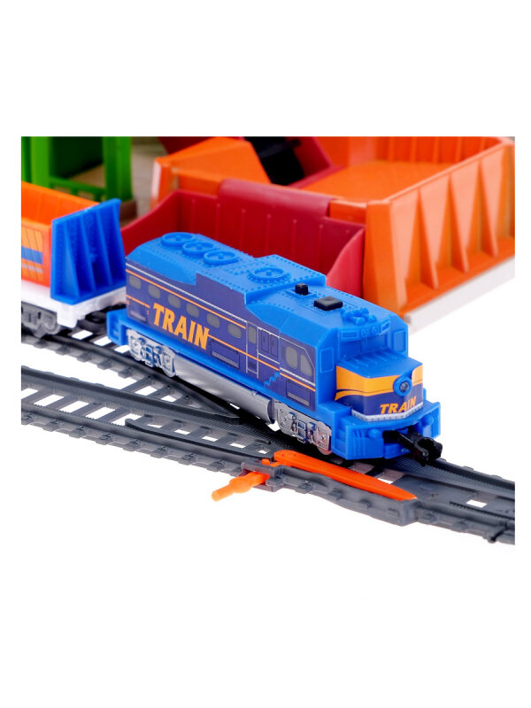 | Подробная комплектация | 1 головной вагон, 4 грузовых вагона, рельсы (42 шт.), камни, 1 погрузчик, станция, элементы декора |