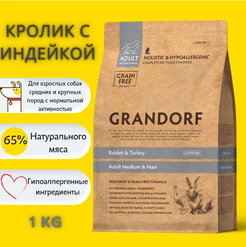 GRANDORF DOG Rabbit&Turkey MED&MAXI кролик индейка 1 кг