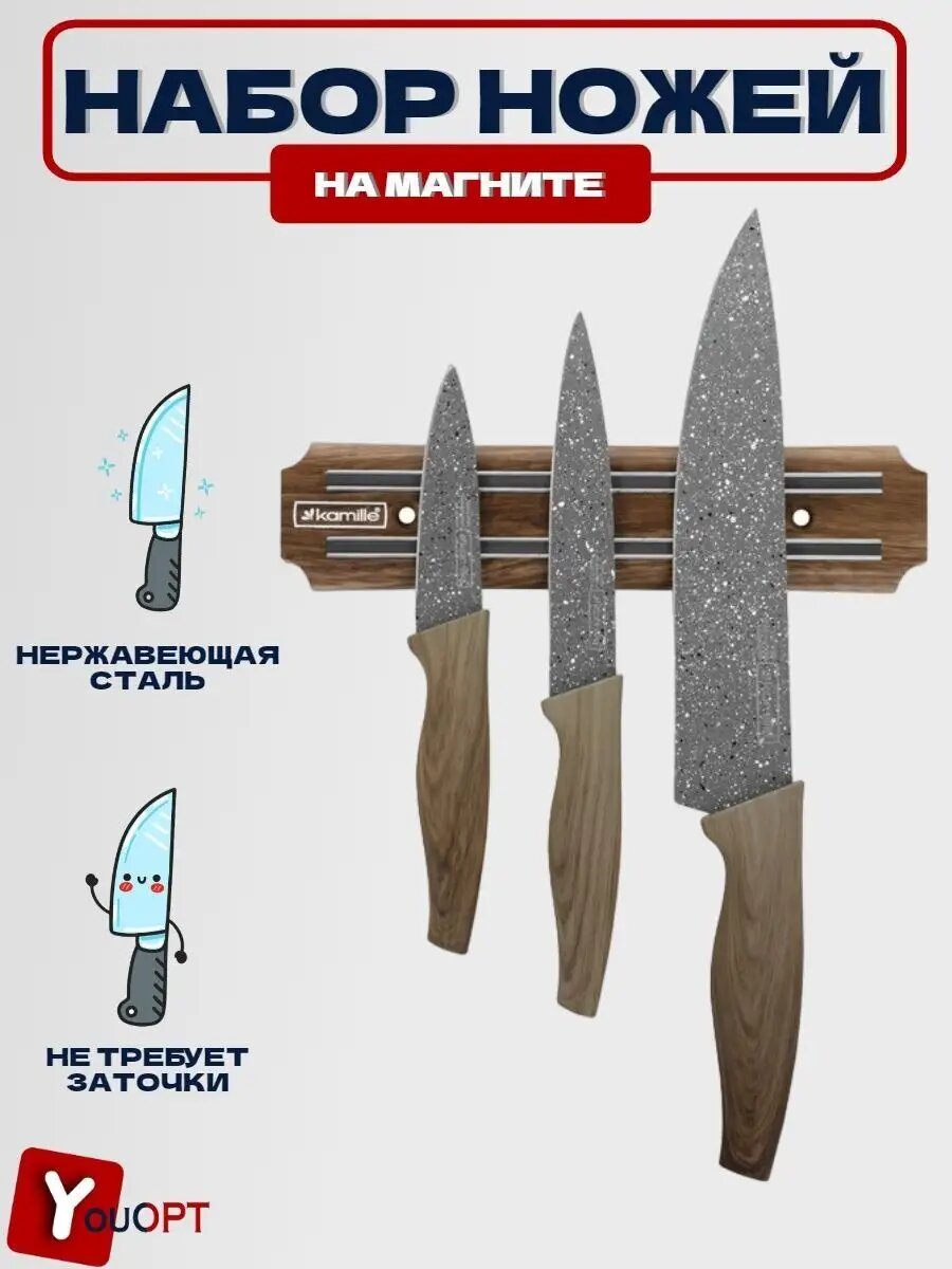 Набор кухонных ножей на магнитной планке Kamille КМ-5148В (4 предмета) (20)