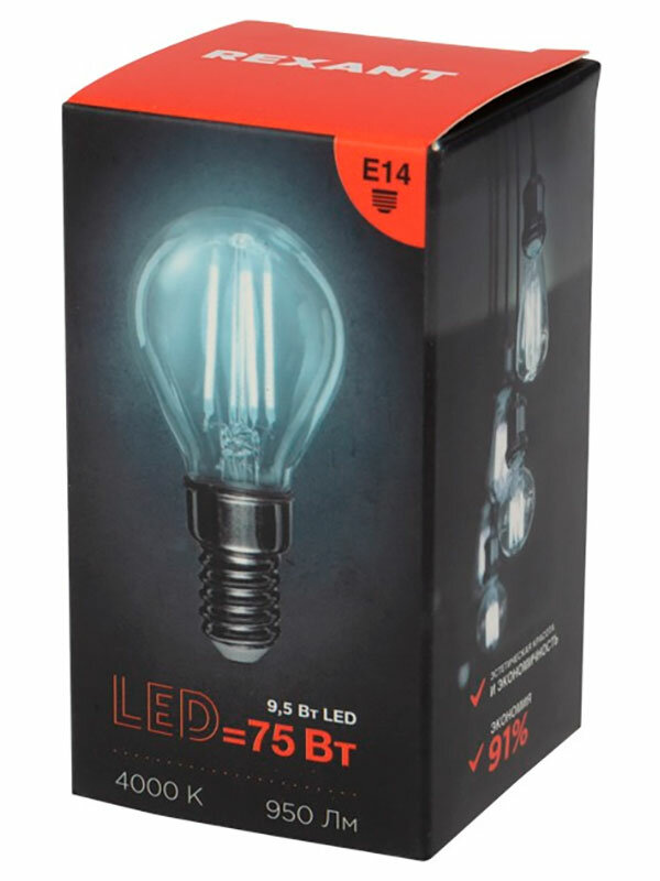 СохранитьЛампа светодиодная REXANT филаментная Шарик GL45 9,5 Вт 950 Лм 4000K E14 прозрачная колба (10/100) интересное: