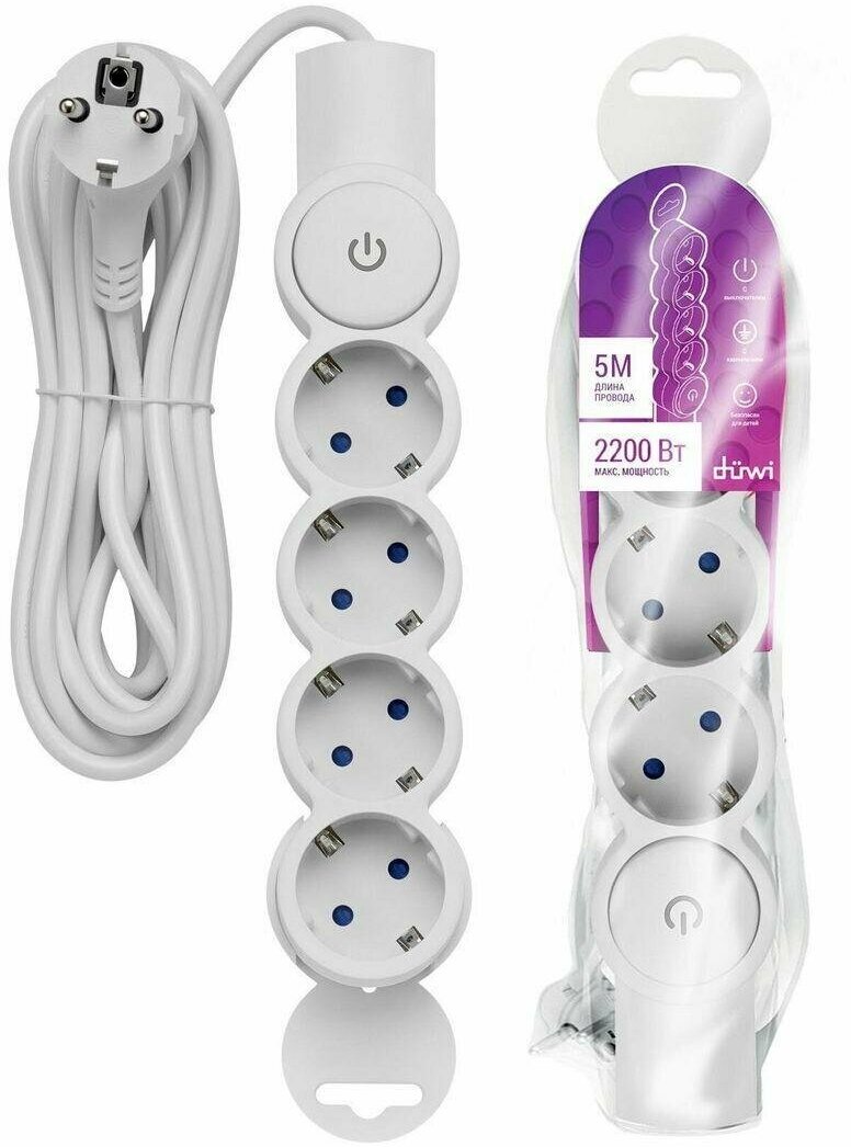 duwi Удлинитель Duwi, 4 розетки, 5 м, 10 А, 2200 Вт, ПВС 3х0.75 мм2, с з/к, с выкл., со шторками