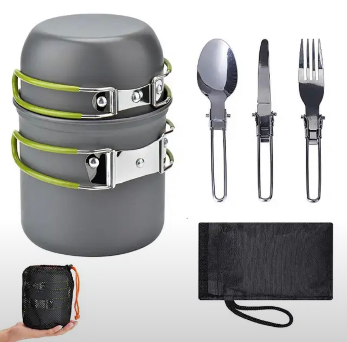 Набор туристической посуды: 2 кастрюли, вилка, ложка, нож