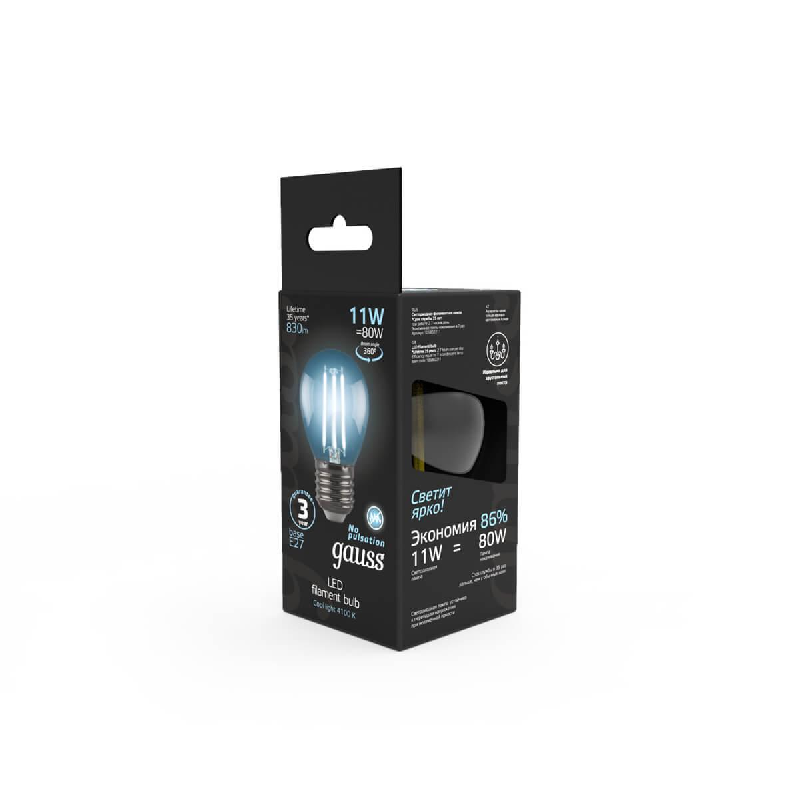 Лампа GAUSS филам. 11Вт цок.:E27 шар 220B 4100K св.свеч.бел.ней. G45 (1шт) (105802211)