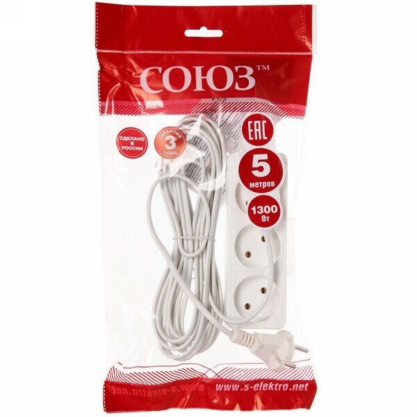 СОЮЗ удлинитель бытовой на 3 гнезда ШВВП 1300Вт без заземления полипропилен 5 м