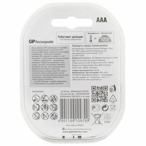 Купить Батарейки аккумуляторные Ni-Mh мизинчиковые комплект 2 шт., AAA (HR03) 650 mAh, GP, 65AAAHC-2DECRC2, 65АAАНС-UC2
