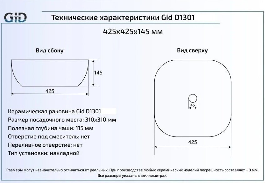 Ниже Вы можете прочитать отзывы на Накладная раковина Gid D1301 42.5х42.5 белая 51180, ознакомится с подробными характеристиками, посмотреть интересные обзоры и фотографии на Накладная раковина Gid D1301 42.5х42.5 белая 51180.