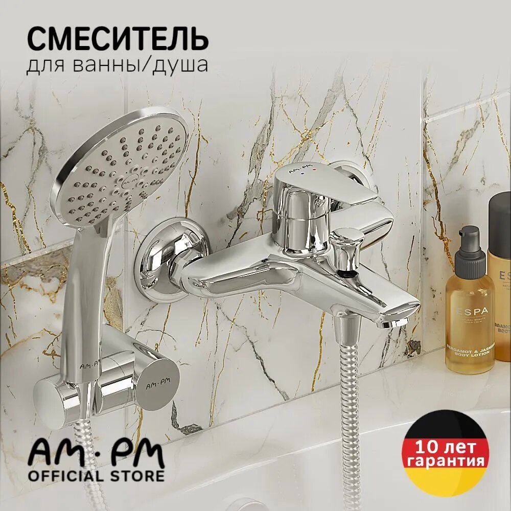 Смеситель для ванны с душем AM.PM Jump, короткий излив 165 мм, кран для ванной с душем, стабилизирующий картридж, покрытие Everlast,5 режимов лейки, Германия, латунь, Гарантия 10 лет