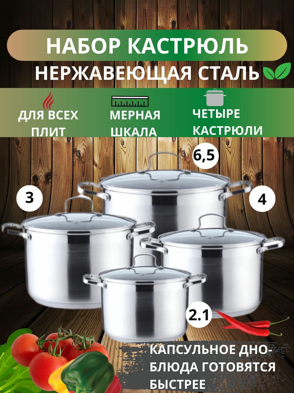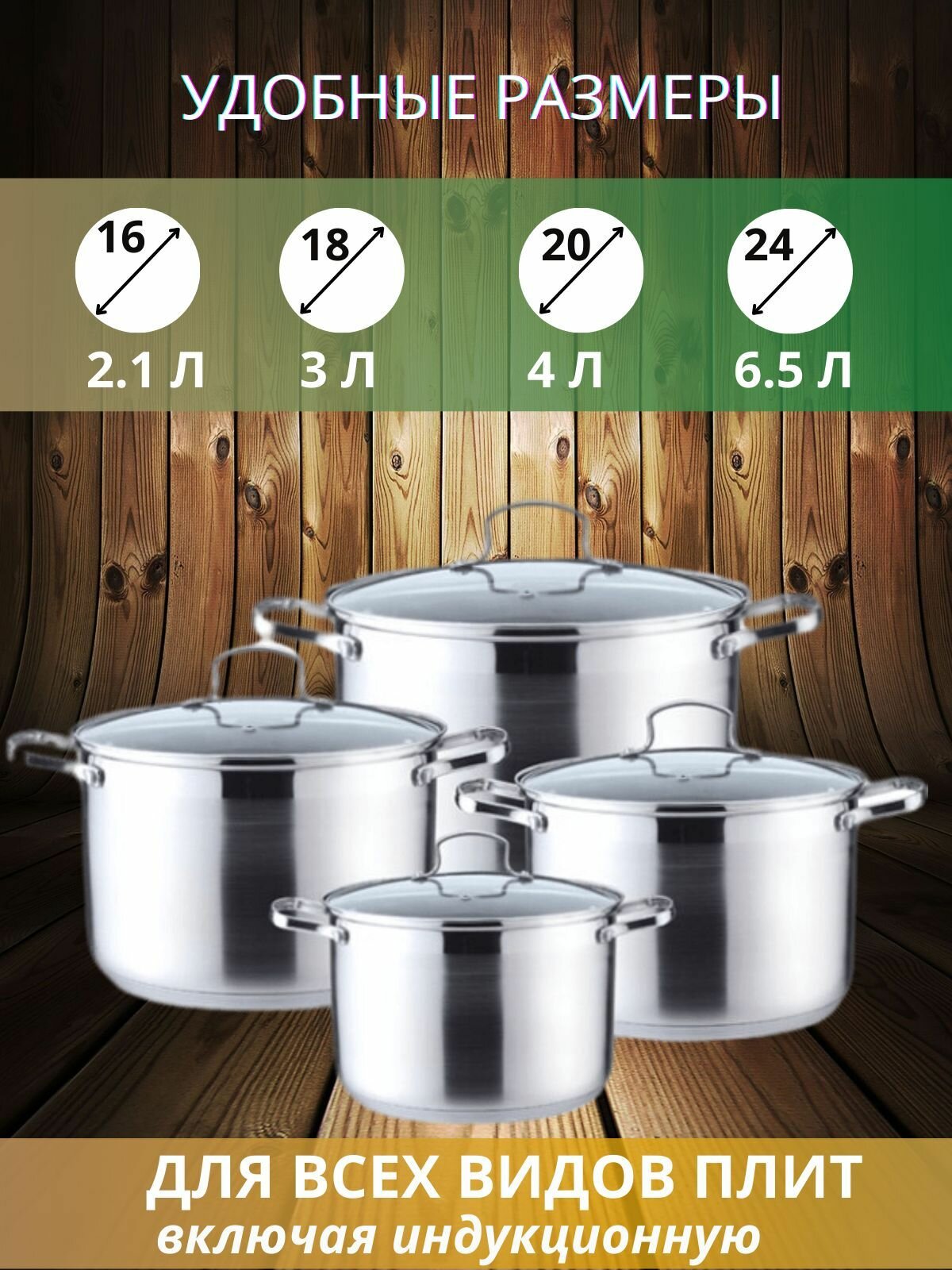 | Комплектация | кастрюли: 2.1 л, 3 л, 4 л, 6.5 л; 4 крышки |
