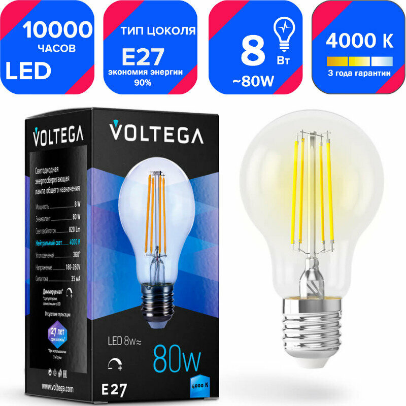Типы/Лампочки/Филаментные Voltega Лампа светодиодная филаментная диммируемая Voltega E27 8W 4000К прозрачная VG10-А1E27cold8W-FD 5490