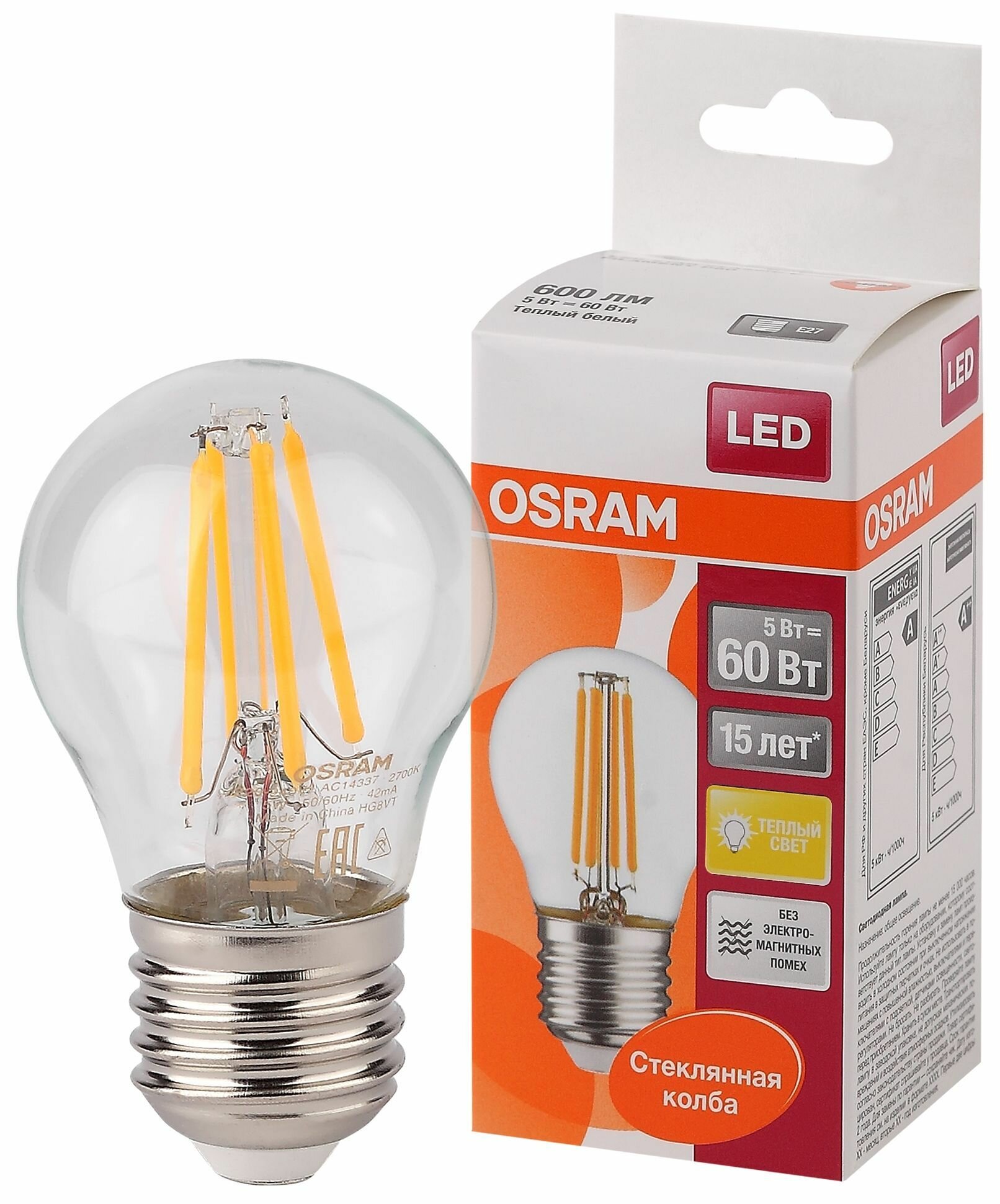 Лампа Osram FIL SCL P60 5W 827 230V CL FIL E27 600lm FS1 шарик, 4058075212510