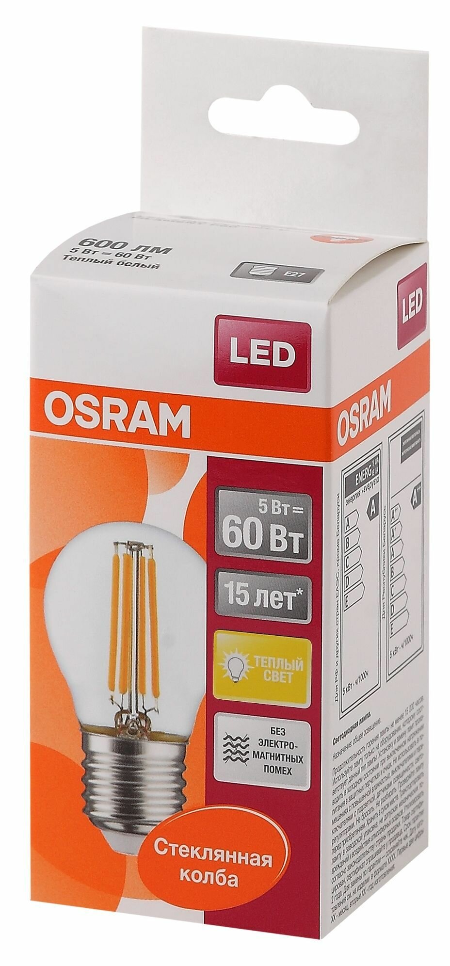 Светодиодная лампа Ledvance-osram FIL SCL P60 5W/827 230V CL FIL E27 600lm FS1 OSRAM - шарик FILLED OSRAM