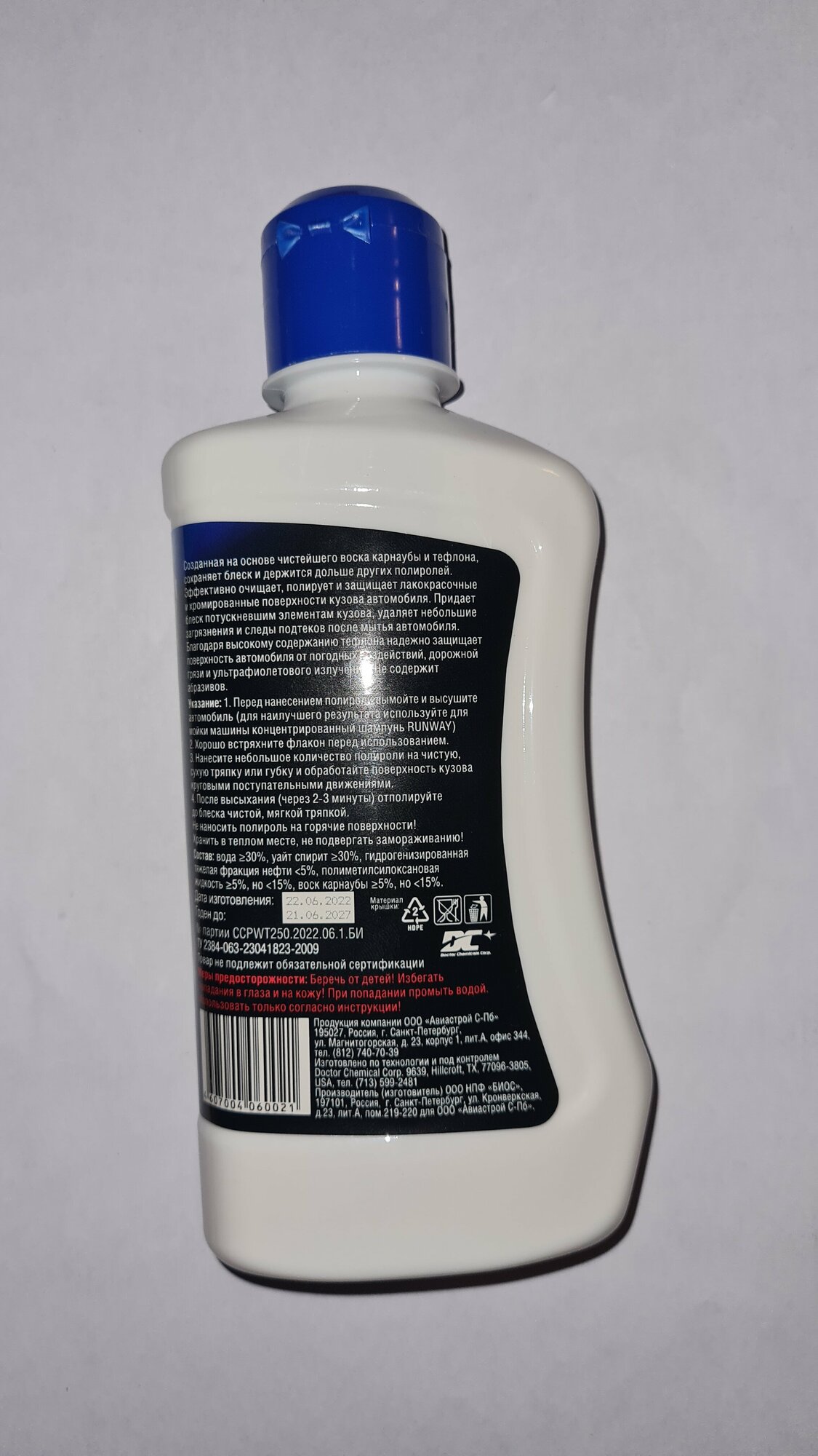 Полироль кузова Runway Carnauba Car Polish With Teflon, с тефлоном и воском карнауба, с защитными свойствами, бутылка 250мл, арт. RW2502