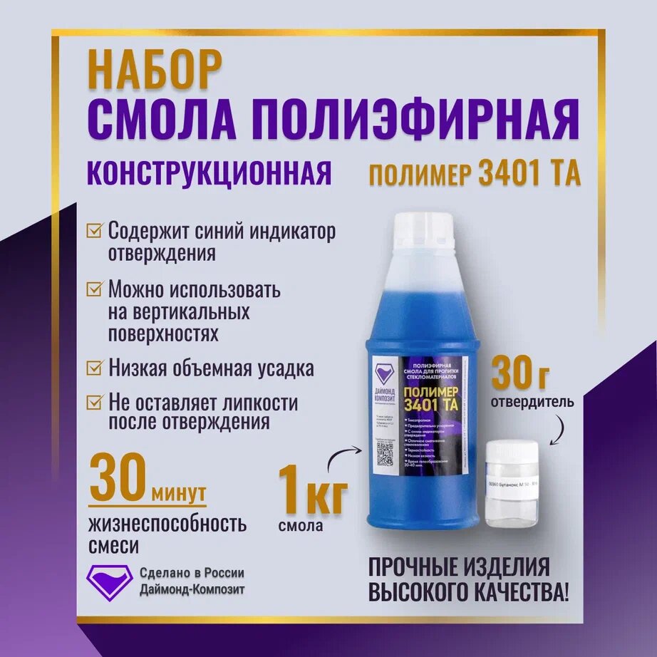 Набор Полиэфирная смола полимер 3401 ТА 1кг + отвердитель BUTANOX 30г Даймонд Композит
