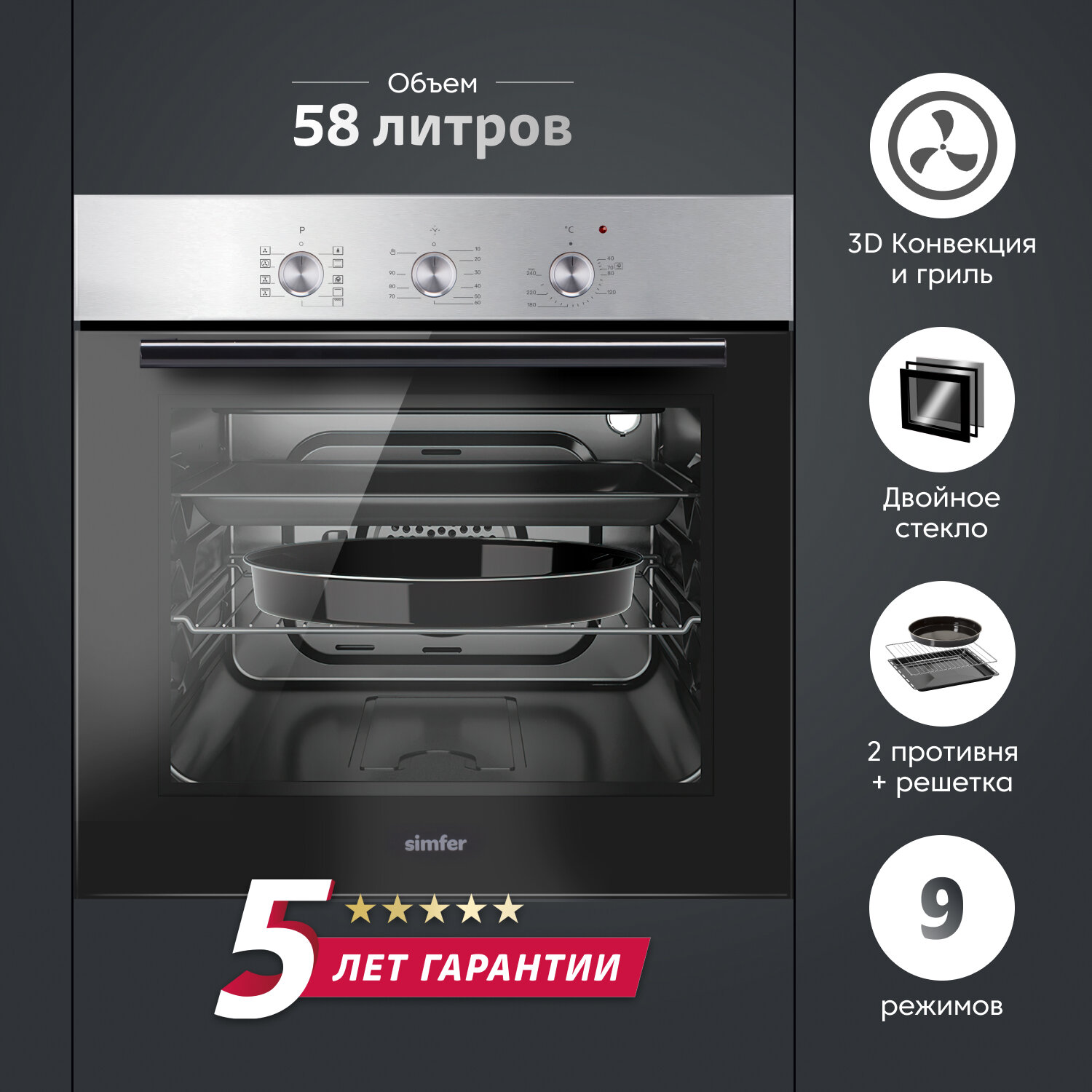 Электрический встраиваемый духовой шкаф Simfer / ширина 60см / 9 режимов работы / 3D конвекция, гриль, таймер / 58 литров / подсветка / 2 противня + хромированная решётка / 5 лет гарантии / черный