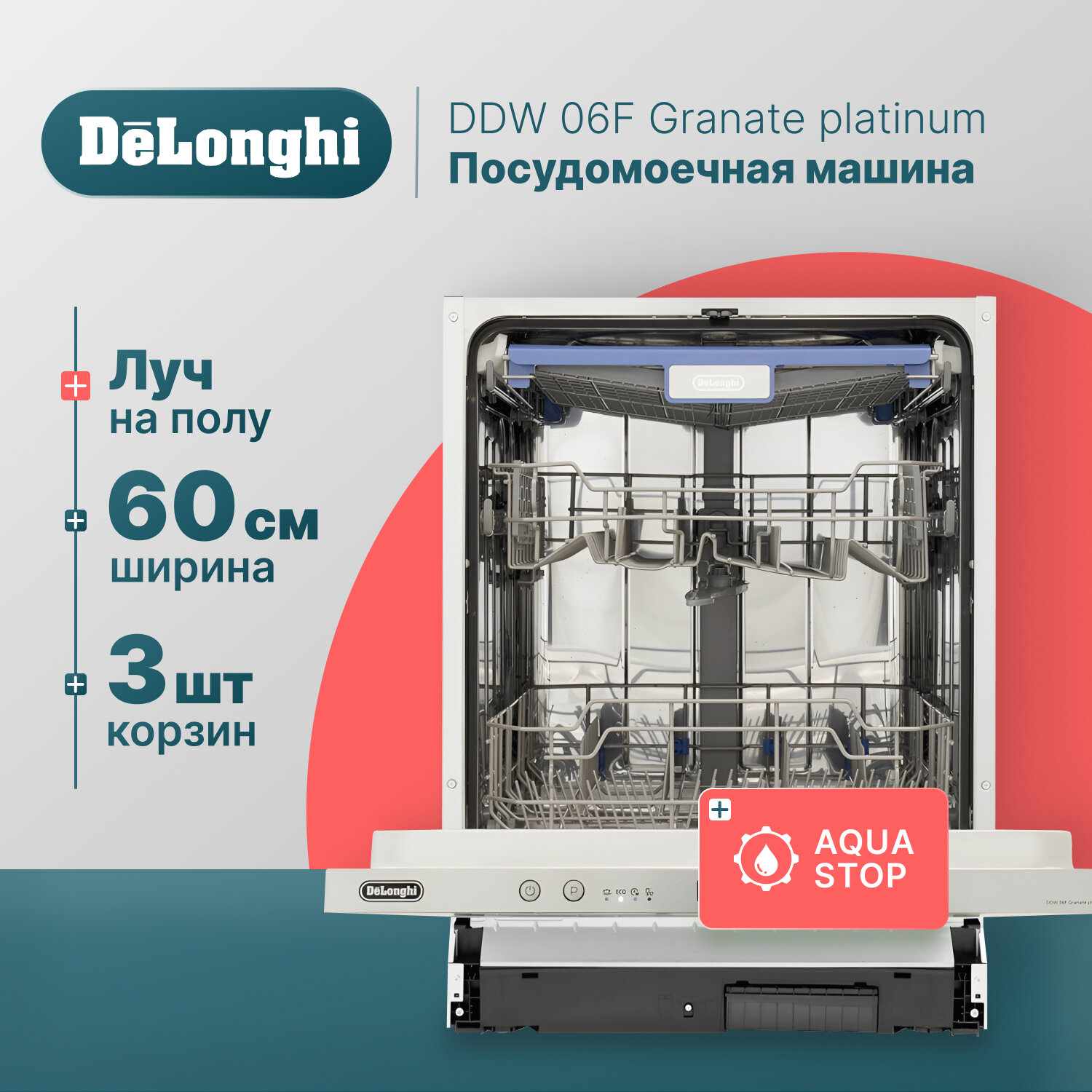 Встраиваемая посудомоечная машина 60 см DeLonghi DDW 06F Granate platinum, 14 комплектов, Aqua Stop, 3 корзины, внутренняя LED-подсветка, посудомойка встраиваемая 60см