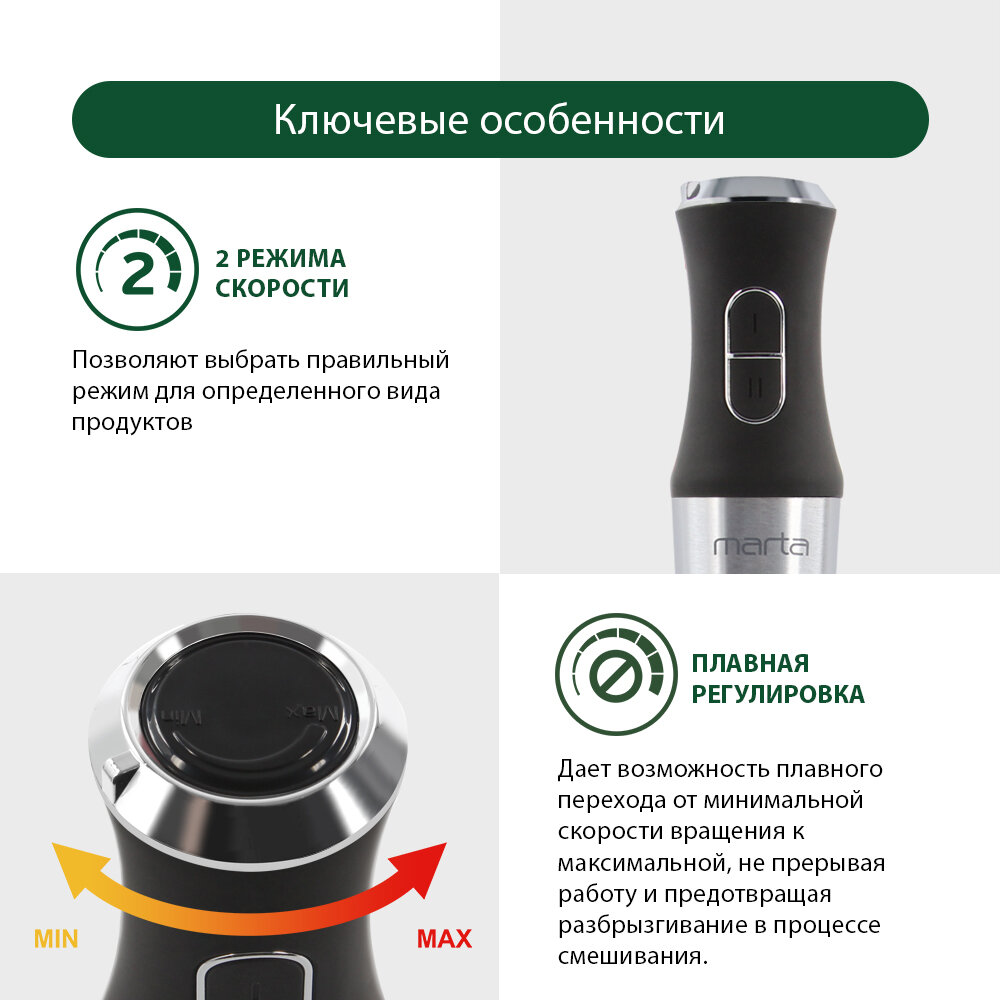 Блендер погружной Марта MT-1566 чоппер корпус металлический 2 скорости 1200Вт черный жемчуг / бытовая техника для кухни / измельчитель электрический