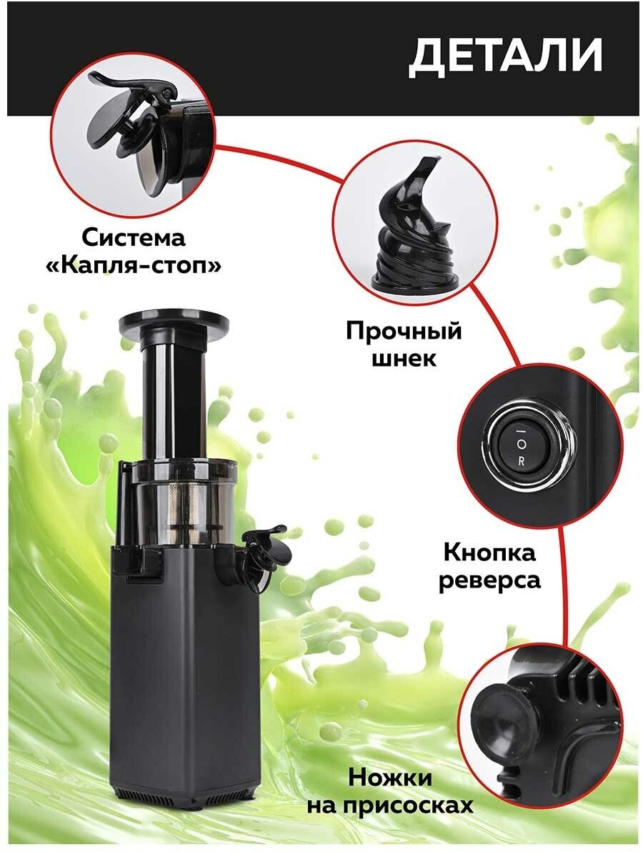 | Особенности | автоматический выброс мякоти / защита от перегрузки / реверс / система «капля-стоп» |