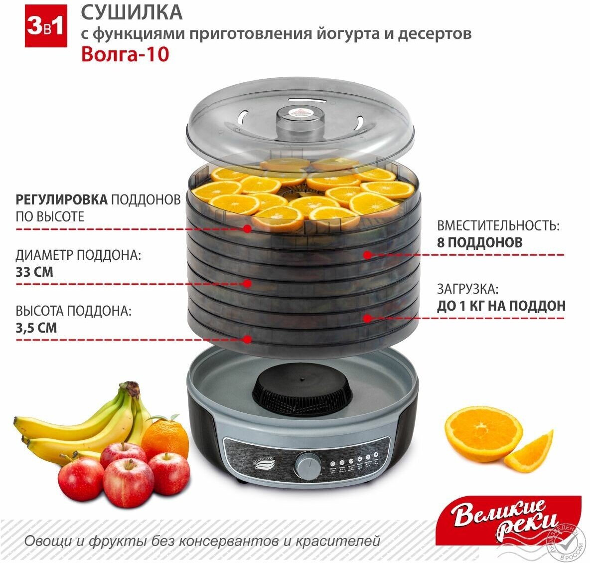 Купить Сушилка для овощей 3в1 с функциями приготовления йогурта и десертов Великие Реки Волга-10 черно-сере .